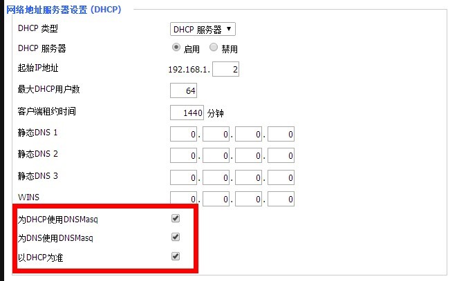 设置→基本设置→网络地址服务器设置 (DHCP),勾选这三个选项