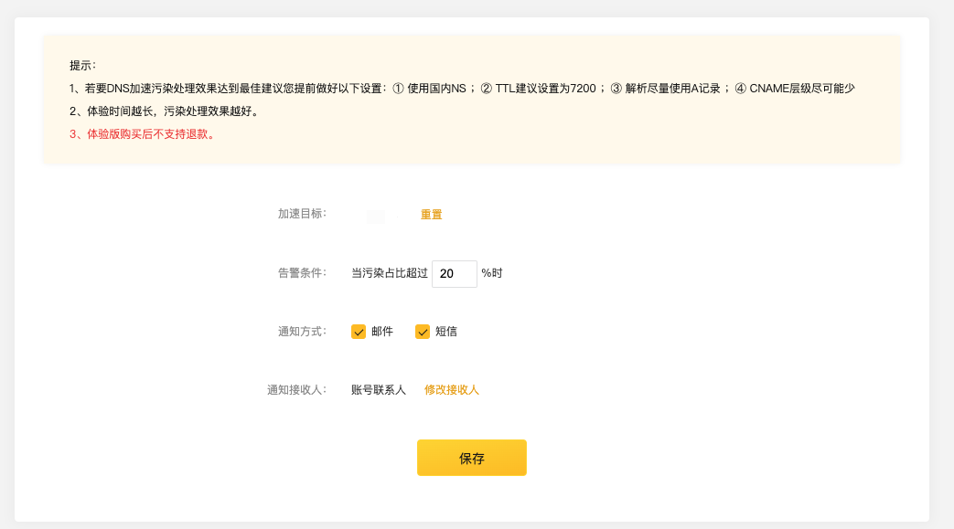 告警条件设置更加简单易懂,由原来的【设置期望解析IP】调整为【设置污染占比阈值】,当污染占比超出您设置的阈值时系统将进行告警,第一时间通知您。