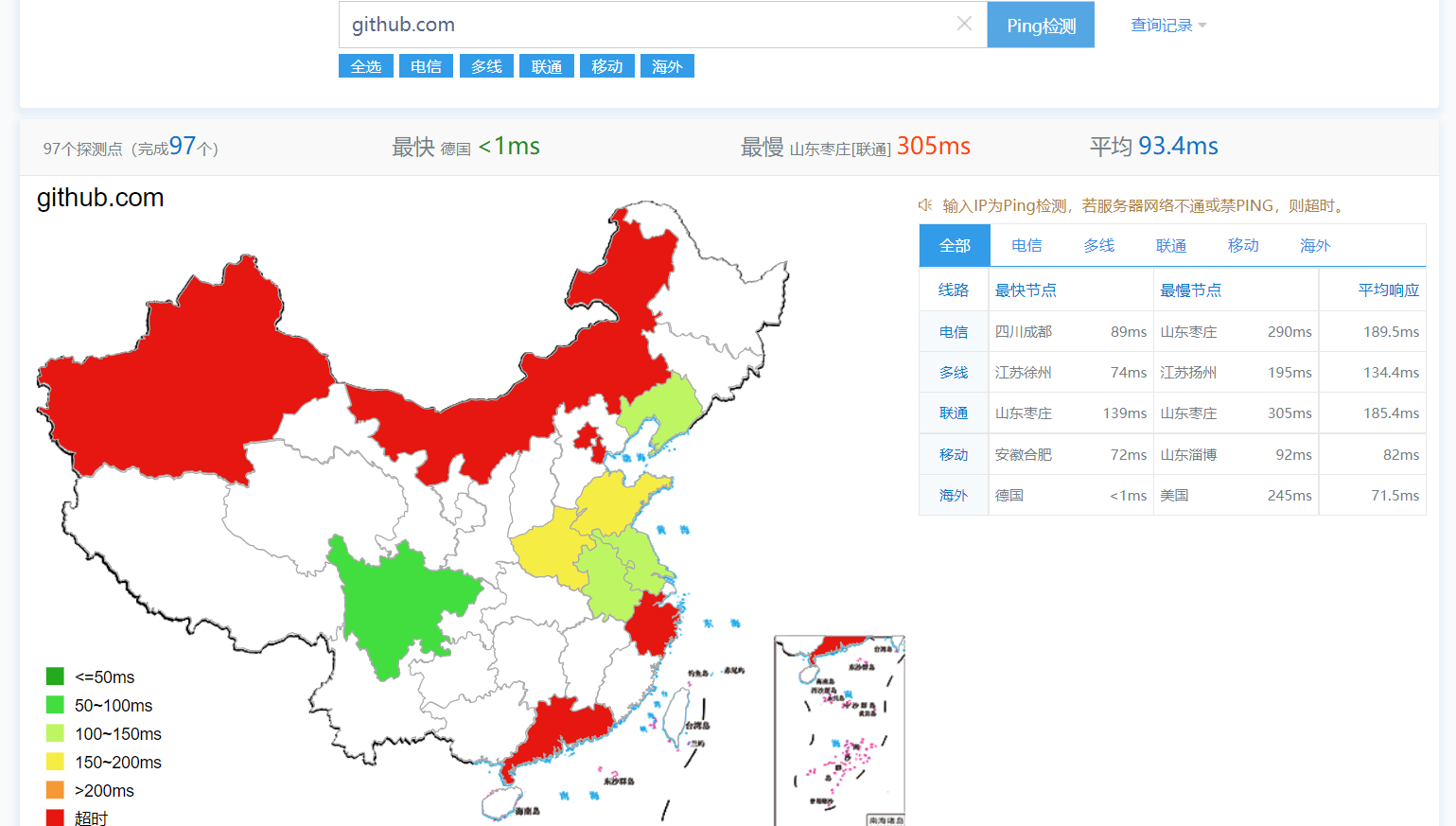 ping工具,例如这个,检测网址、IP 地址的通讯情况。输入要检测的网址github.com,点击「Ping 检测」。工具提供的服务是利用自己分布在各地的网络节点的本机ping工具,执行对网址的ping操作,汇总结果,统计响应网址的服务器 IP。 - 检测结果如下图示。共计 106 个检测点,其中接受响应速度最快的节点在加拿大,目标服务器对其响应时间为 14ms;最慢在中国香港,响应时间 243ms。在成功访问的所有节点中,目标服务器的平均响应时间是 163.5ms。地图与颜色响应了国内不同省市的访问时间,红色说明访问超时,白色说明没有参与节点;约偏向绿色则响应时间越短。右侧还有一个统计表。这里的情况是:国内节点无法