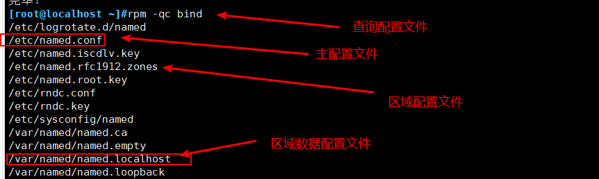 rpm -qc bind #查询bind软件配置文件所在路径 /etc/ named. conf #主配置文件 /etc/ named.rfc1912.zones #区域配置文件 /var/named/named.localhost #区域数据配置文件