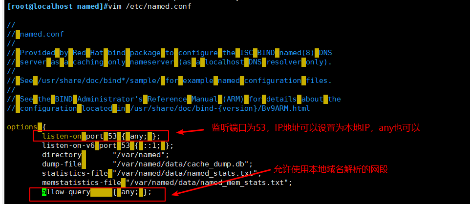 options { listen-on port 53 { 192.168.80.80; }; #监听53端口,ip地址使用提供服务的地址ip,也可以用any代表所有 # listen-on-v6 port 53 { ::1; }; #ipv6不需要,注释即可 directory "/var/named"; dump-file "/var/named/data/cache_dump.db"; statistics-file "/var/named/data/named_stats.txt"; memstatistics-file "/var/named/data/named_mem_stats.txt"; recursing-file "/var/named/data/named.recursing"; secroots-file "/var/named/data/named.secroots"; allow-query { any; }; #允许使用本DNS解析服务的网段,也可以用any ...}