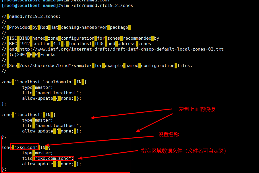 vim /etc/named.rfc1912.zones #文件里有模版,可复制粘贴后修改 zone "benet.com" IN { #正向解析"benet.com"区域 type master; #类型为主区域 file "benet.com.zone"; #指定区域数据文件为benet.com.zone allow-update { none; } ; };