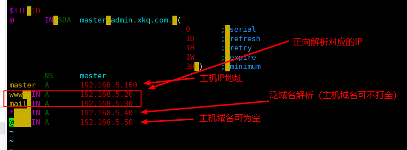 1.1 修改主域名服务器的区域配置文件,修改正、反向区域配置