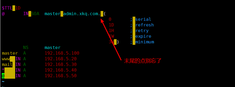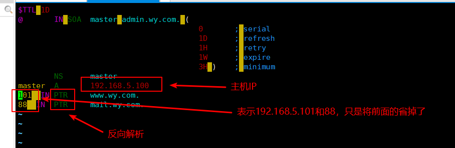 cd /var/ named/ cp -p named. localhost benet .com.zone.local vim /var/named/benet.com.zone.local $TTL 1D @ IN SOA benet.com.admin.benet.com. ( #这里的“@”代表192.168.116段地址 0 ; serial 1D ; refresh 1H ; retry 1W ; expire 3H ) ; minimum NS benet. com. A 192.168.80. 10 200 IN PTR WWW.benet.com. 100 IN PTR mail.benet.com. #PTR为反向指针,反向解析192.168.80.200地址结果为www.benet.com.