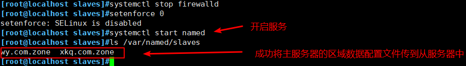 1.4.主从服务器都需要关闭防火墙,安全防护并且重启服务,并查看区域数据文件是否已下载成功,最后配置临时DNS地址。