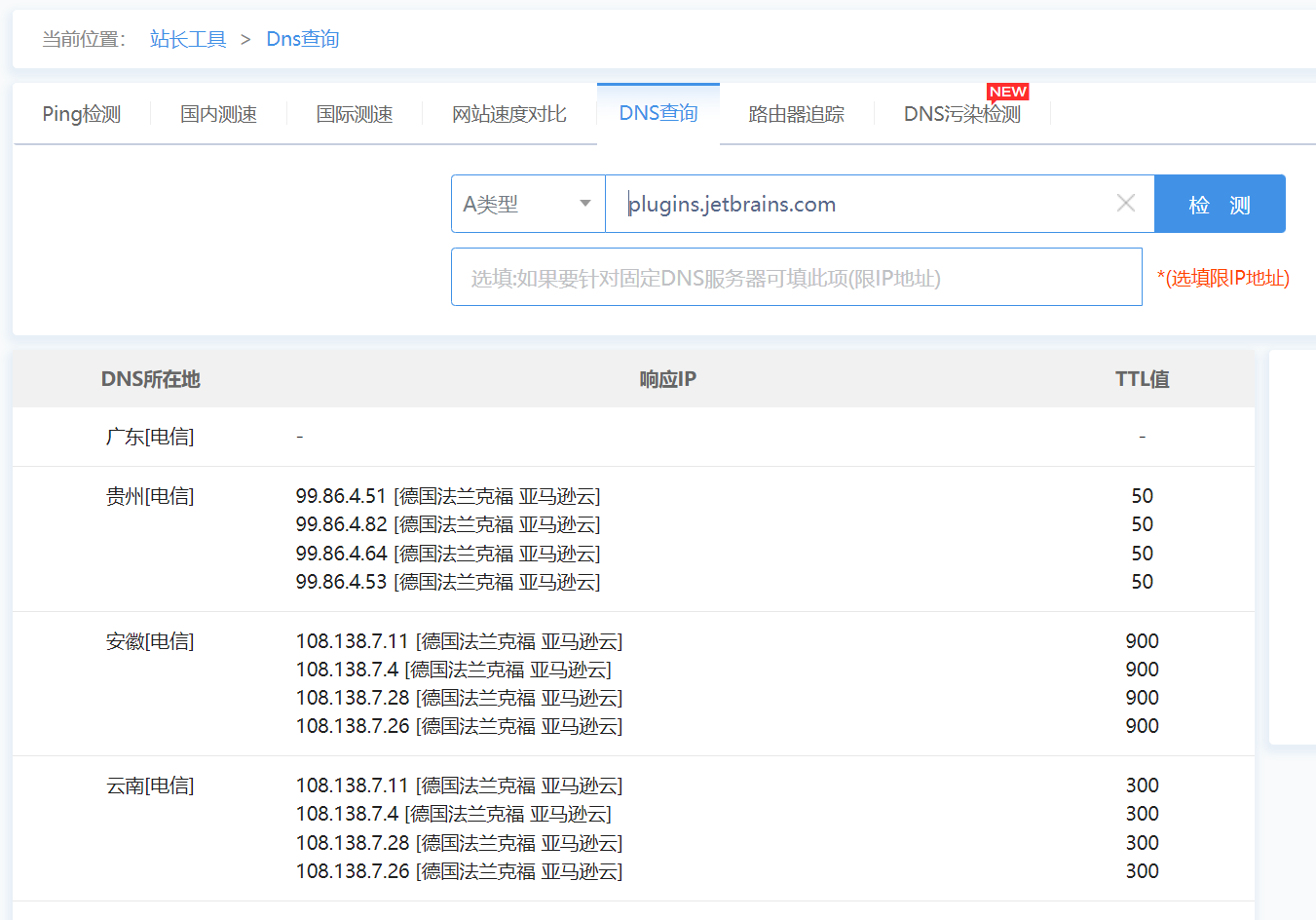 打开http://tool.chinaz.com/dns/该网址,通过 DNS 查询解析的方式,找到访问plugins.jetbrains.com速度最快的响应 ip