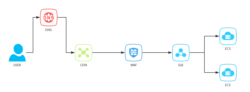 我们重点来关注一下CDN-→WAF-→SLB-→ECS这几层服务的关系。