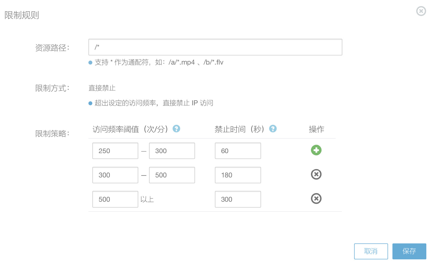 - 禁止时间:又拍云的计数周期是固定的,60s。禁止时间最小值也是60s。