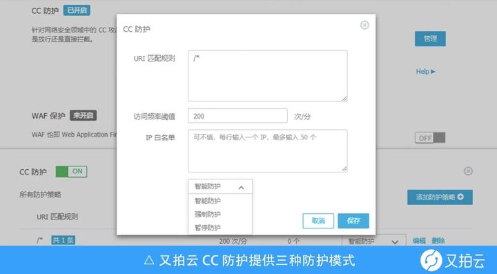 又拍云针对恶意 IP 访问、CC 攻击、SQL 注入等安全问题提供了 IP 访问限制、CC 攻击、WAF 防护等功能。