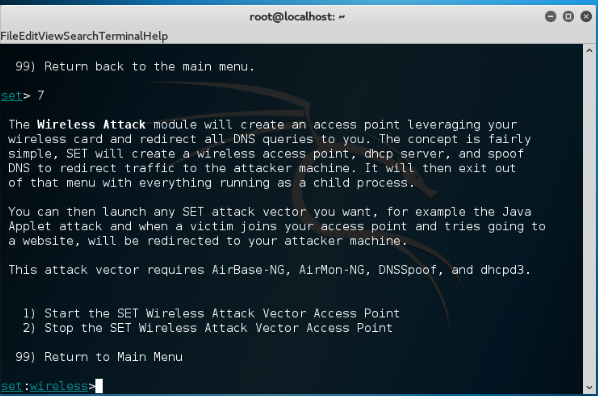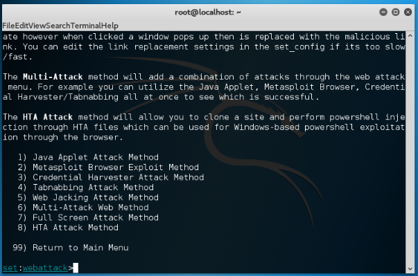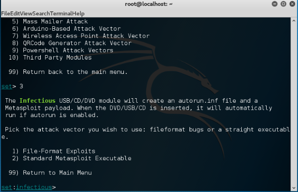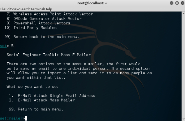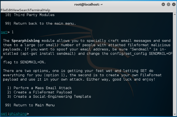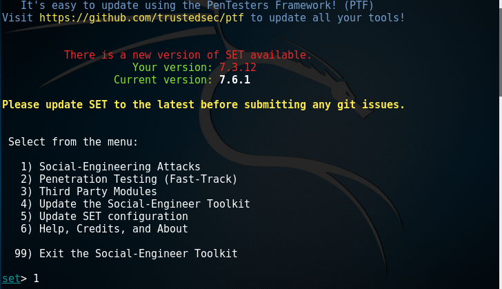 菜单选项: 1是社会工程学攻击,2是Fast-Track渗透测试,3是第三方模块