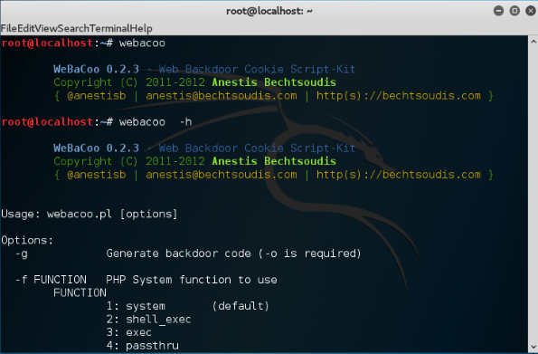 WeBaCoo(Web Backdoor Cookie)script-kit是一个小巧的、隐蔽的php后门,它提供了一个可以连接远程web服务器并执行php代码的终端。WeBaCoo使用HTTP相应传送命令结果,shell命令经base64编码后隐藏在Cookie头中。