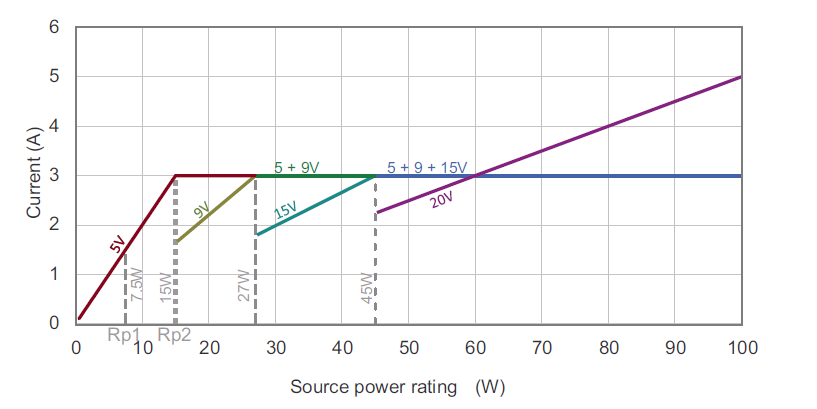 Source Port (provider) This port is able to supply power over VBUS (5 V to 20 V and up to 5 A), and must assert a pull-up resistor (Rp) resistor on the configuration channel (CC) pins