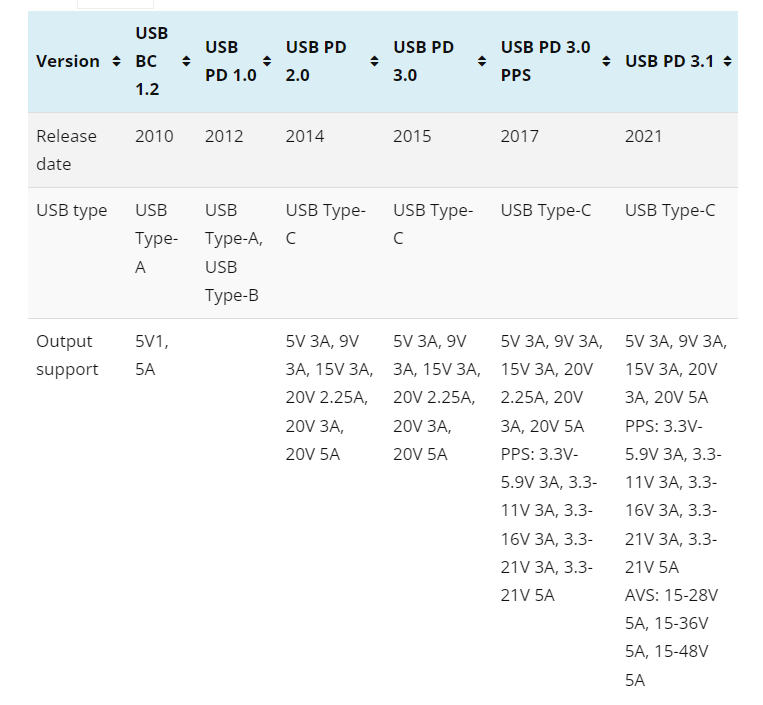 USB BC 1.2 vs PD 1.0 vs PD 2.0 vs PD 3.0 vs PD 3.0 PPS vs USB PD 3.1 – Specs Sheet
