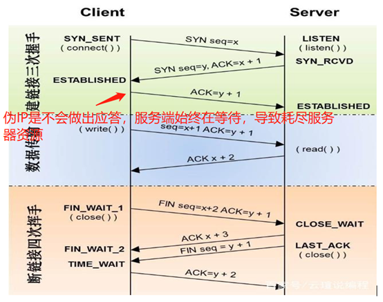 攻击者发送大量的这种伪造源地址的SYN请求,服务端会消耗很多的资源(CPU和内存)来处理这种半连接,同时还要对这些请求进行SYN/ACK重试,最后的结果就是服务器无暇理睬正常的连接请求,导致拒绝服务。这就是DDoS的攻击原理。