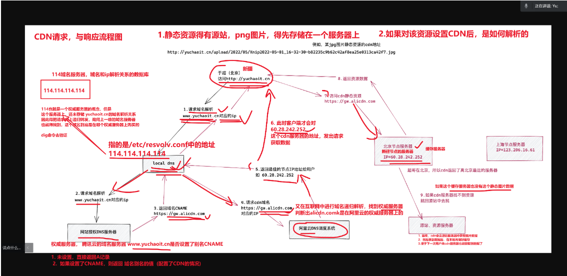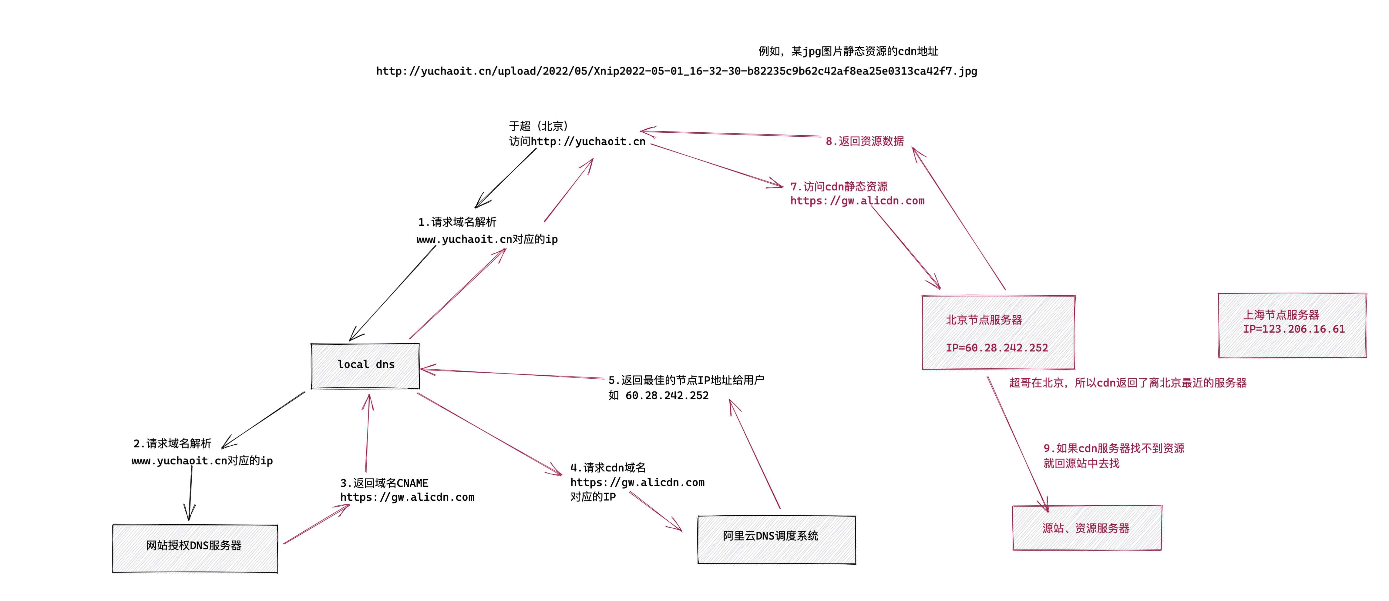 1.当用户(人在北京)访问www.yuchaoit.cn域名下的指定资源时,首先向本地DNS发起域名解析请求 2.LDNS检查缓存中是否有www.yuchaoit.cn的IP地址记录,有则直接返回给用户;没有向授权服务器发起DNS查询; 3.授权DNS服务器解析www.yuchaoit.cn时,返回域名的CNAME(又指向了另一个cdn域名) 4.此时该请求就已经发给了阿里云的cdn服务器,经过阿里云的DNS调度系统,返回该cdn域名对应的最佳IP地址(离该用户最近的) 5.此时LDNS获得阿里DNS返回的cdn解析的IP地址。 6.用户拿到了cdn的ip地址 7.用户向该ip发起资源请求。 - 如果该cdn对应的节点已经缓存了该静态资源,数据直接返回给用户 - 若cdn服务器中的资源过期或不存在,该节点会向源站发起该资源的请求,拿到资源后,结合用户设置的CDN缓存策略,将资源缓存到该节点,便于下次访问。 至此cdn请求结束。