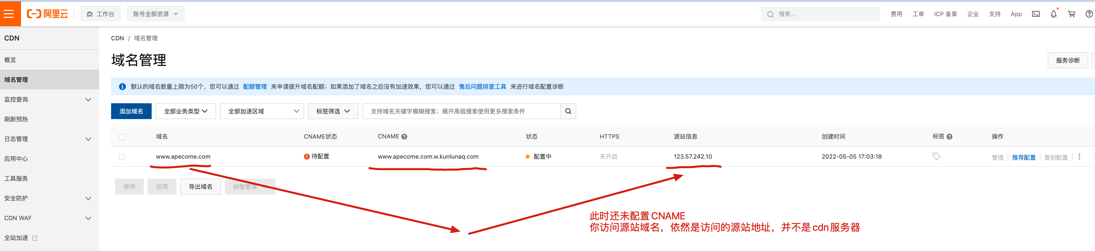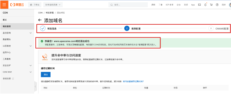 请注意,提示你,还剩下CNAME的配置,该cdn域名就可以用了。