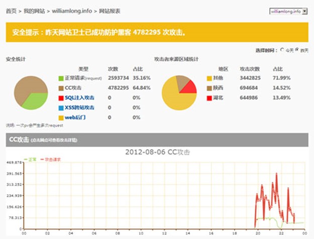 通常防止CC攻击的方法有几种,一个是通过防火墙,另外一些网络公司也提供了一些防火墙服务,例如XX网站卫士和XX宝,还有一种方法是自己写程序预防,昨天网站遇到CC攻击,这也让我尝试了一下各种防止CC攻击方法的有效性。