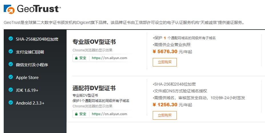 1.GeoTrust是全球第二大数字证书颁发机构Digicert旗下品牌。该品牌证书由工信部许可设立的电子认证服务机构“天威诚信”提供鉴证服务。
