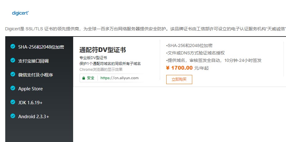 2.Digicert是 SSL/TLS 证书的领先提供商,为全球一百多万台网络服务器提供安全防护。该品牌证书由工信部许可设立的电子认证服务机构“天威诚信”提供鉴证服务。