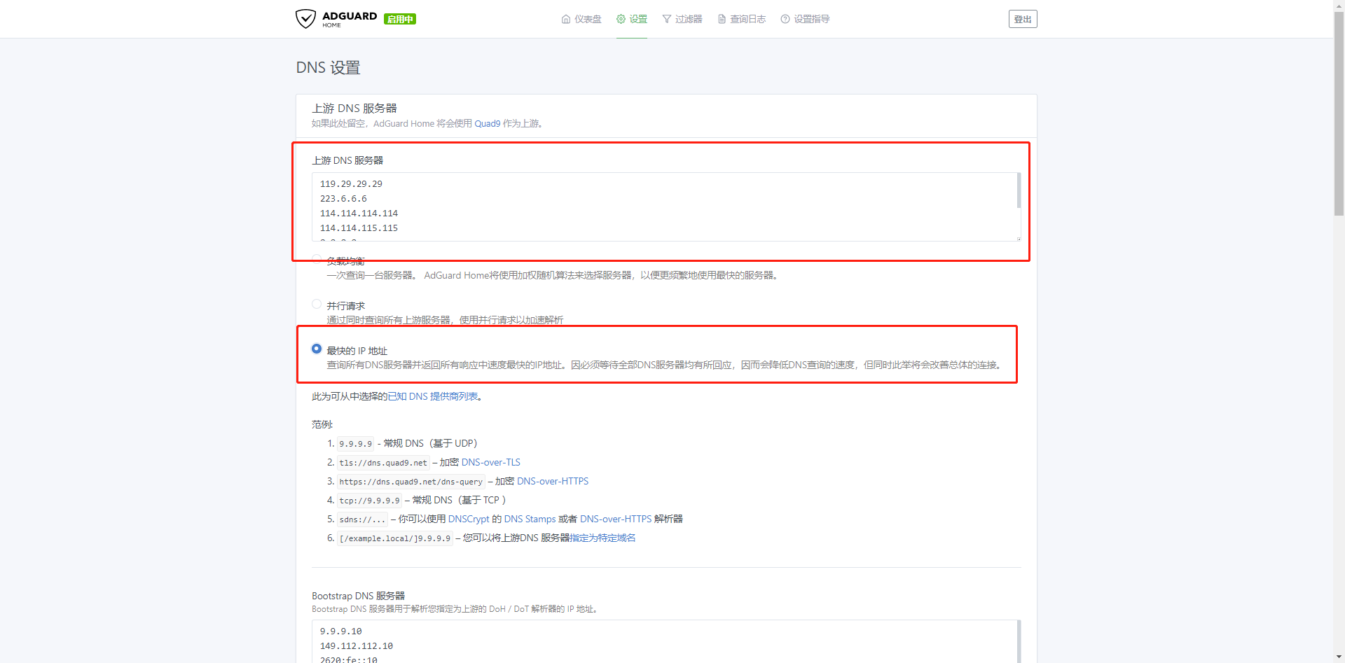 清空原来的上游DNS 加入以下: 119.29.29.29 223.6.6.6 114.114.114.114 114.114.115.115 8.8.8.8 8.8.4.4 223.5.5.5 119.28.28.28 测试保存并启用 按需选择 最快IP 或 并行解析