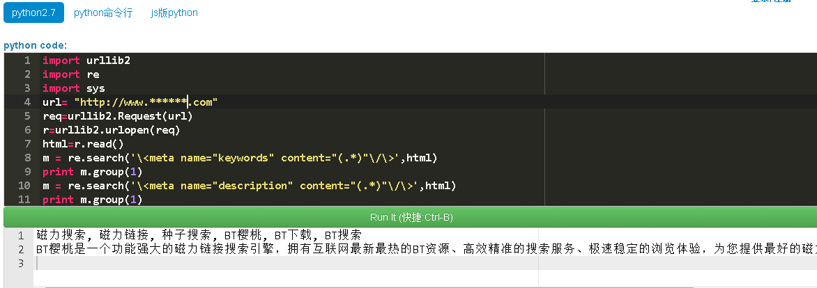 import urllib2 import re import sys url= "http://www.*****.com" req=urllib2.Request(url) r=urllib2.urlopen(req) html=r.read() m = re.search('<meta name="keywords" content="(.*)"/>',html) print m.group(1) m = re.search('<meta name="description" content="(.*)"/>',html) print m.group(1)