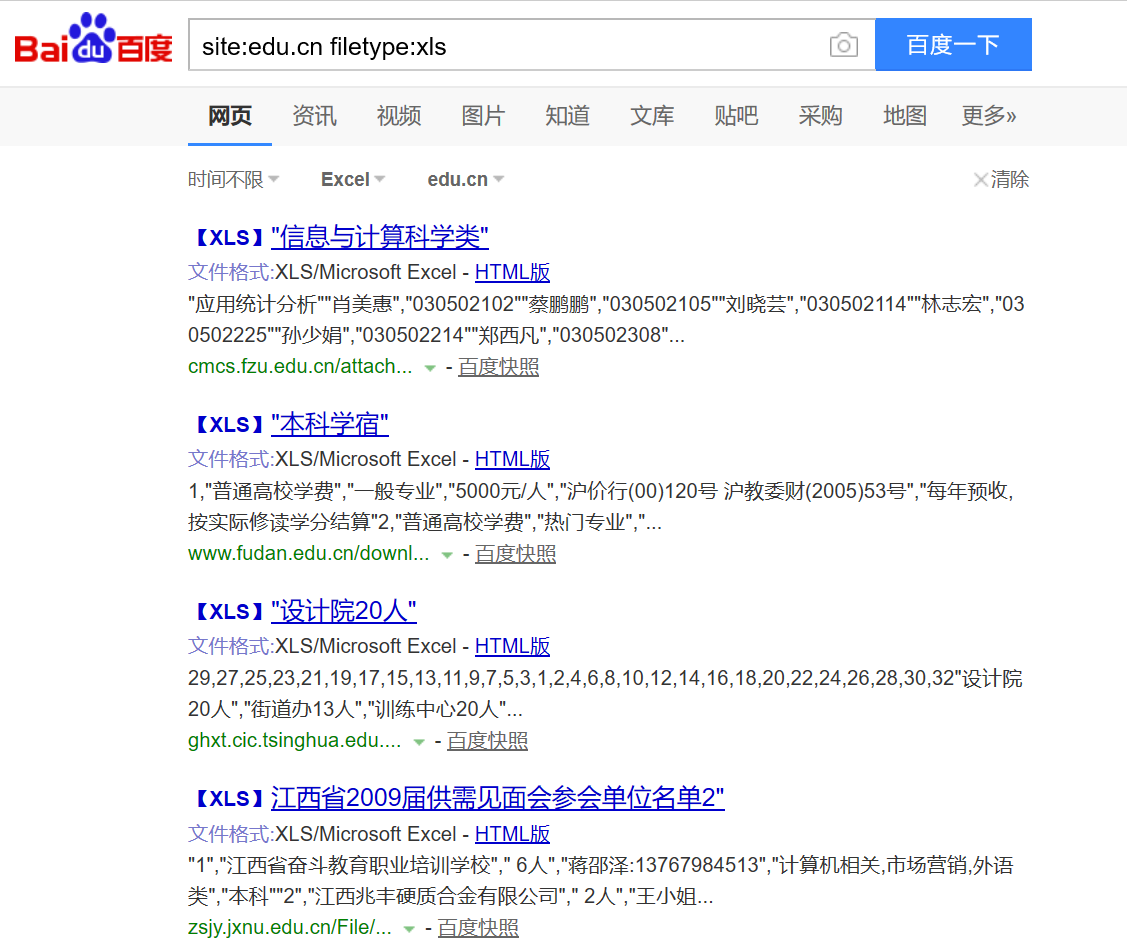百度搜索site:edu.cn filetype:xls,可以找到符合要求的文件: