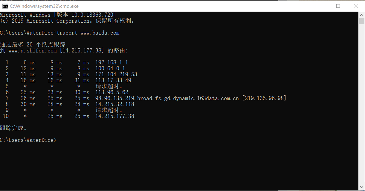 cmd中输入tracert www.baidu.com