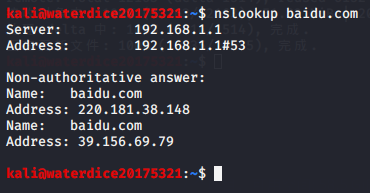 nslookup可以得到DNS解析服务器保存的Cache的结果,但并不是一定准确的。在终端输入nslookup baidu.com