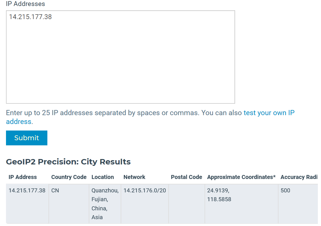 在网站中输入IP地址可以查看到百度的IP信息: