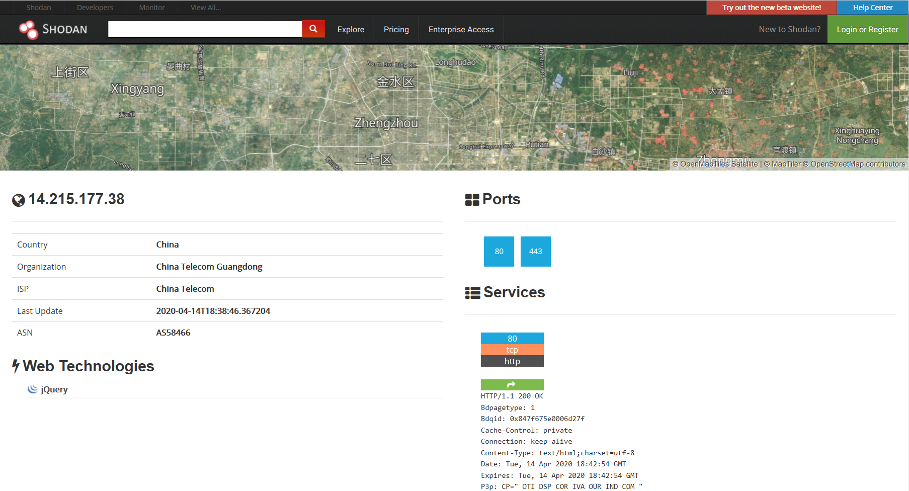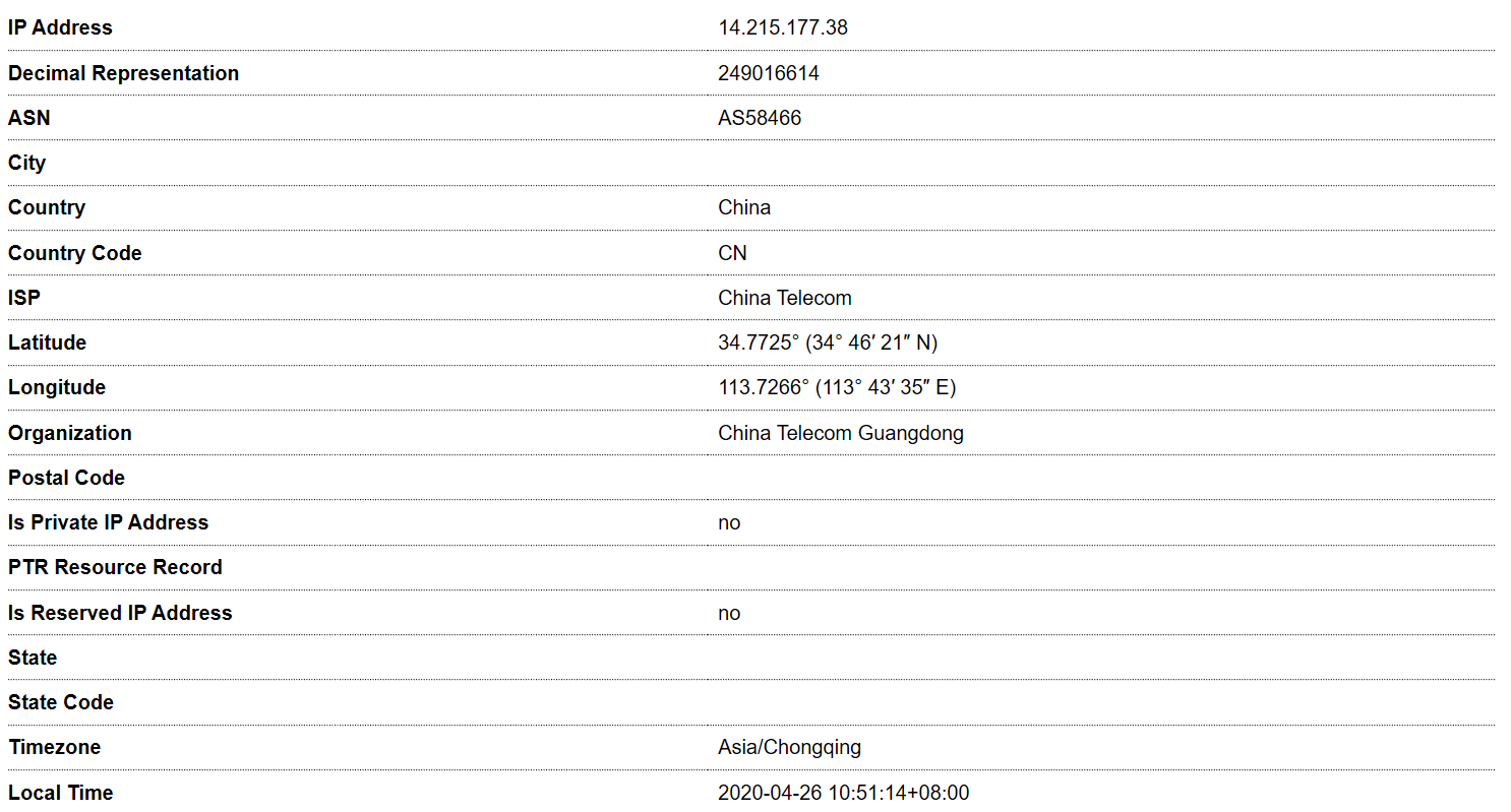 这个网站可以查询到更详细的关于IP的信息,在该网站输入百度的IP地址14.215.177.38后查看结果,可以看到很多关于该IP的详细信息: