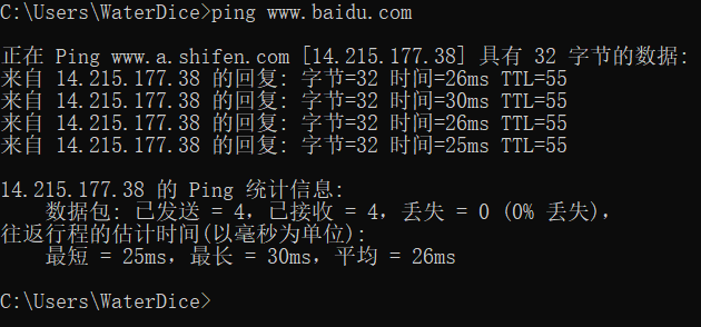 ping命令用发送ICMP报文的方法检测活跃主机,cmd中输入命令ping www.baidu.com