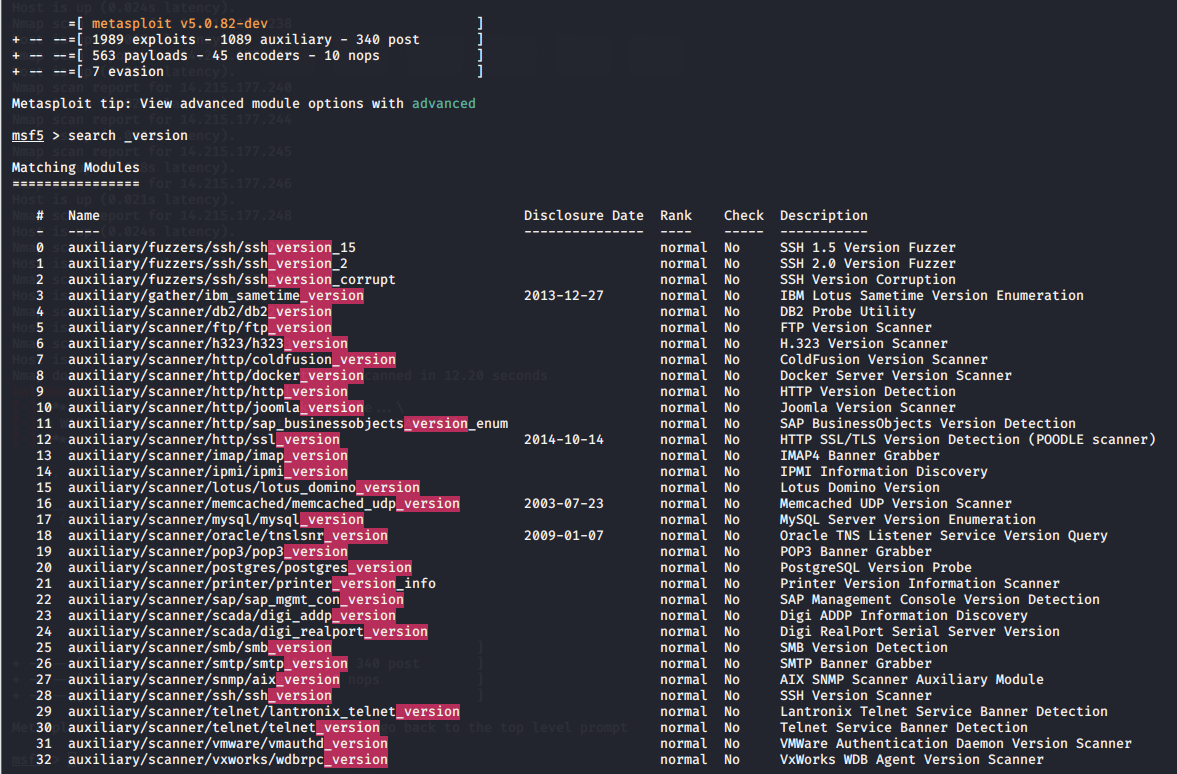通过输入search _version指令查看msf中可提供的查点辅助模块,有如下模块可以应用: