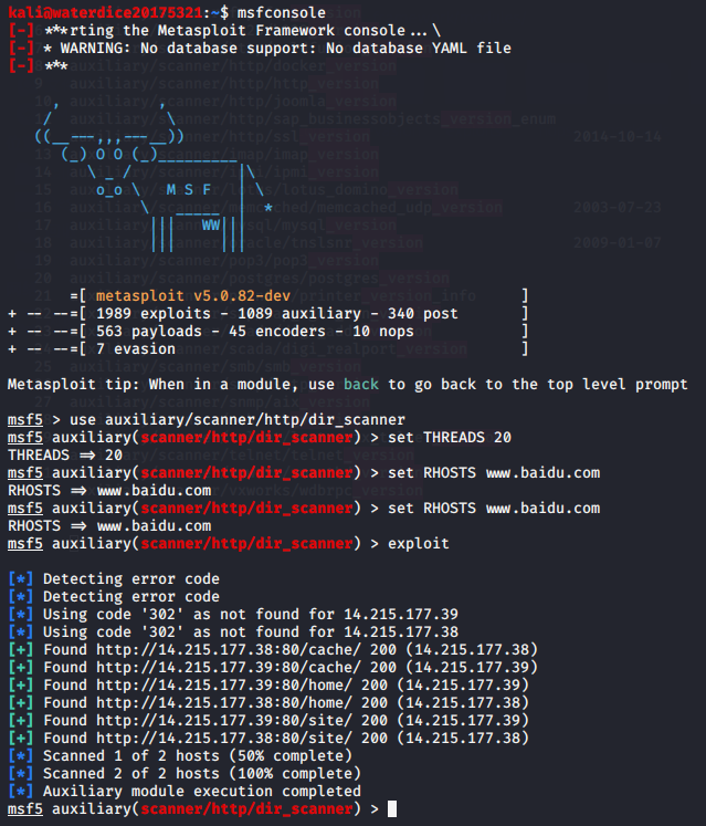 use auxiliary/scanner/http/dir_scanner set THREADS 20 set RHOSTS www.baidu.com exploit