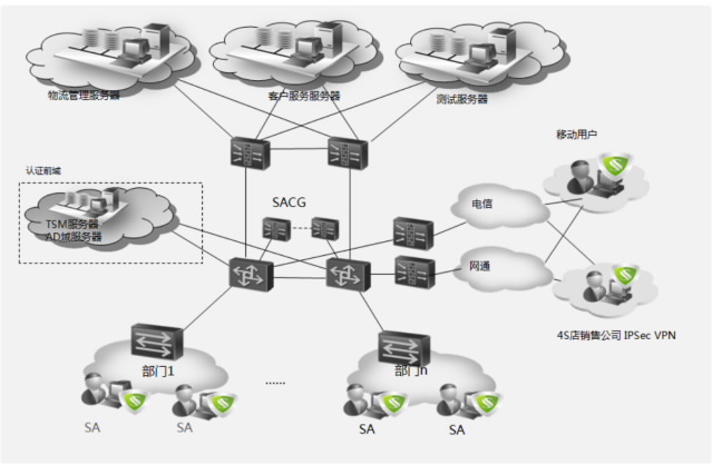 最后在总部部署专业的SSL VPN设备SVN产品,为移动办公用户灵活的接入集团总部,访问总部资源提供安全的VPN保障。