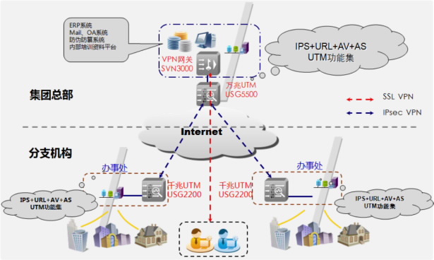 其次,在人员较多的分支办事处部署USG2200系列千兆UTM防火墙,为各个分支机构提供全面的UTM防护功能,并且每个分支机构与总部的USG5500产品建立IPsec VPN互联,为分支和总部的数据传输提供安全加密保障。