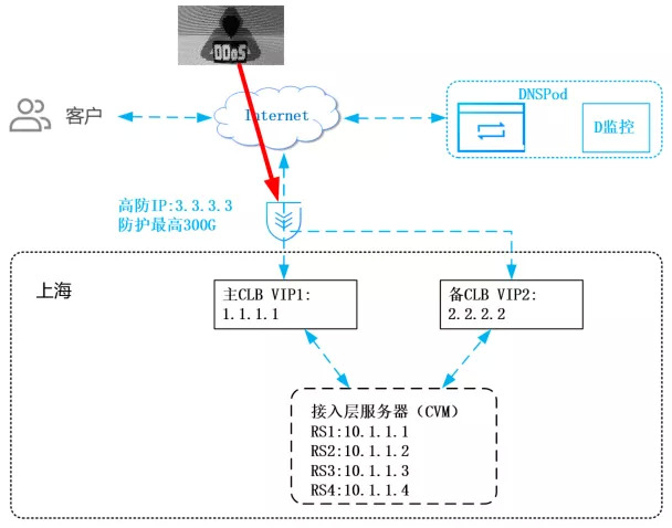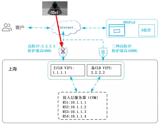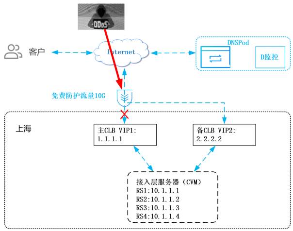 虽然主 CLB 因为 DDoS 攻击无法提供服务,但是可以通过 DNSpod 快速切换到备份 VIP:2.2.2.2 实现在 10 分钟内恢复了 90% 的用户访问(前提是准备了备份 VIP 可以切换)。