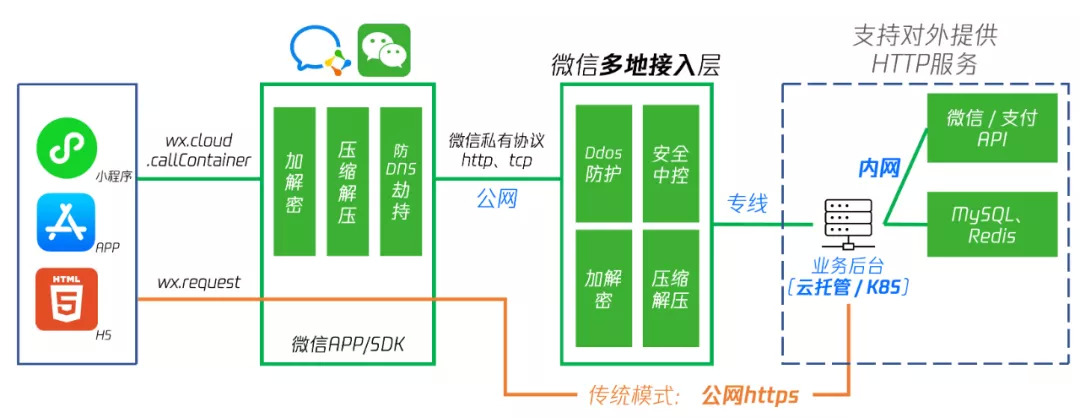 使用微信云托管,业务的公网数据,经过一个简单的 API 替换,就可以自动转译成微信的私有协议,不再提供公网访问的 HTTPS 入口,而且企业无需改造存量业务,只需要改变前端的接口调用方式,即可将业务跑在微信的安全通道中,最终到达业务的后台服务。