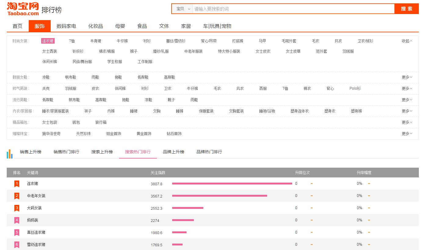 打开界面,进入淘宝天猫关键词排行榜,点击“完整榜单”–>服饰–>搜索热门排行榜,可以得到: