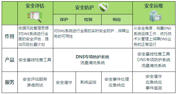 主要从产品和服务两个方面,来构成DNS安全解决方案,产品主要包括安全基线检查系统、DNS专项防护系统、流量清洗系统;服务主要包括针对DNS系统的安全评估服务、渗透测试服务、安全值守服务、系统监控服务、安全事件处理、应急响应、事件追溯等