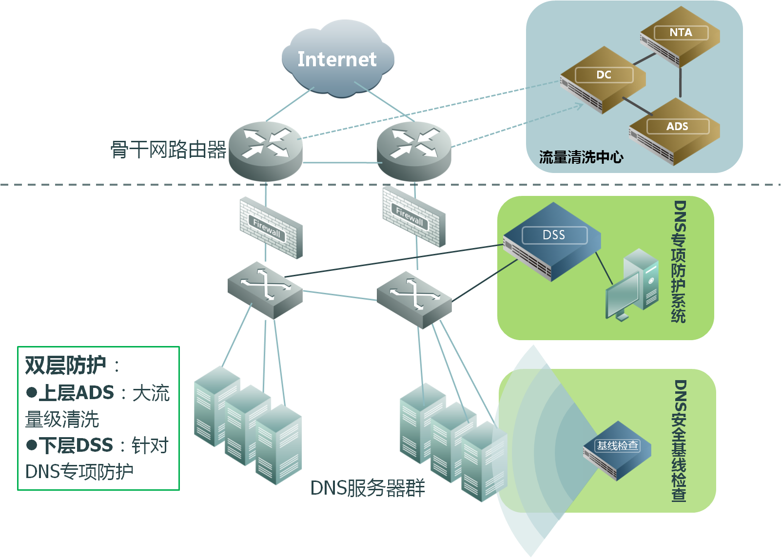 构建DNS系统双层立体防护体系:运营商骨干网部署流量清洗中心,进行大流量级清洗;在DNS系统前部署DNS专项防护系统,进行有针对性的细粒度的清洗,基线检查工具;用于日常安全检查评估工作。部署示意图如下所示: