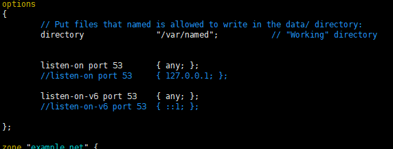 1 /* 2 Sample named.conf BIND DNS server 'named' configuration file 3 for the Red Hat BIND distribution. 4 5 See the BIND Administrator's Reference Manual (ARM) for details about the 6 configuration located in /usr/share/doc/bind-{version}/Bv9ARM.html 7 */ 8 9 options 10 { 11 // Put files that named is allowed to write in the data/ directory: 12 directory "/var/named"; // "Working" directory 13 14 15 //listen-on port 53 { any; }; 16 listen-on port 53 { 127.0.0.1; }; 17 18 //listen-on-v6 port 53 { any; }; 19 listen-on-v6 port 53 { ::1; }; 20 21 };