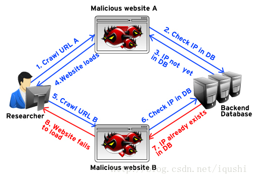 假设安全厂商和研究人员有和特定攻击相关的网站列表。他们会连上一个网站(手动或使用自动化工具),但攻击者会在自己的后端资料库记录此特定IP地址已经连过与此攻击相 关的网站,如果安全厂商和研究人员想要连到资料库内的其他网站,那将无法成功存取恶意内容。