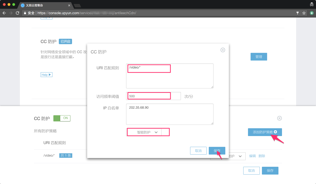- 第一步:添加防护策略,设置 URI 匹配规则,例如:/video/*