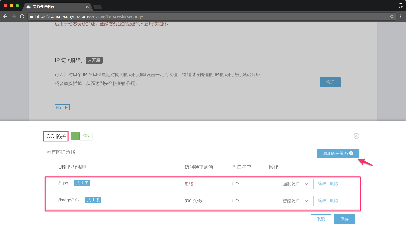 登陆 CDN 控制台,依次进入:服务管理 > 功能配置 > 访问控制 > CC 防护,点击「管理」按钮即可开始配置。如下图所示: