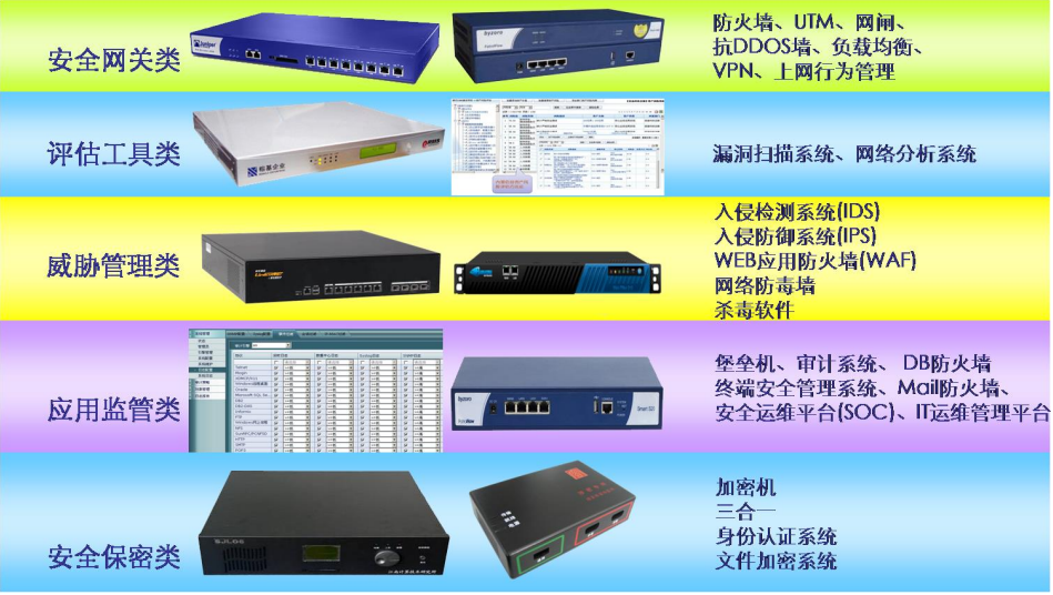 3)中国军用标准分类:物理安全产品、平台安全产品、网络安全产品、数据安全产品、用户安全产品、管理安全产品 (6个类)