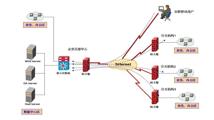 3)防火墙的部署:部署于内、外网边界和各个区域之间,用于权限访问控制和安全域划分。