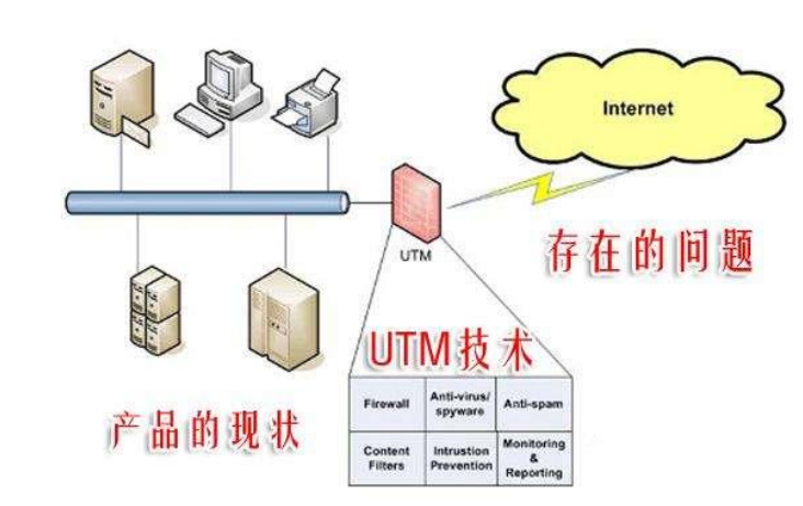 1)UTM简介:统一威胁管理(Unified Threat Management),简称UTM。 2004年9月,IDC首度提出“统一威胁管理”的概念,即将防病毒、入侵检测和防火墙安全设备划 归统一威胁管理(Unified Threat Management)新类别。 在防火墙基础上发展起来,具备防火墙、IPS、防病毒、防垃圾邮件等综合功能。 由于同时开启多项功能会大大降低UTM的处理性能,因此主要用于对性能要求不高的中低端领域。 在高端应用领域,比如电信、金融等行业,仍然以专用的高性能防火墙、IPS为主流。