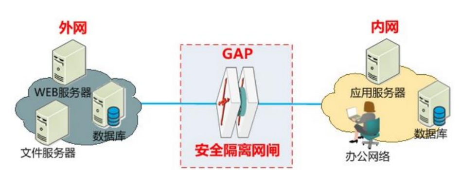 1)网闸简介: 网闸(GAP)全称安全隔离网闸。 安全隔离网闸是一种由带有多种控制功能专用硬件在电路上切断网络之间的链路层连接,并能够在 网络间进行安全适度的应用数据交换的网络安全设备。 相比于防火墙,能够对应用数据进行过滤检查,防止泄密、进行病毒和木马检查。