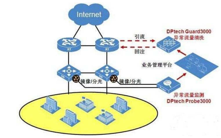 2)抗DDOS防火墙的部署:部署于外网边界前端,或将数据引流至过滤引擎,最终回流